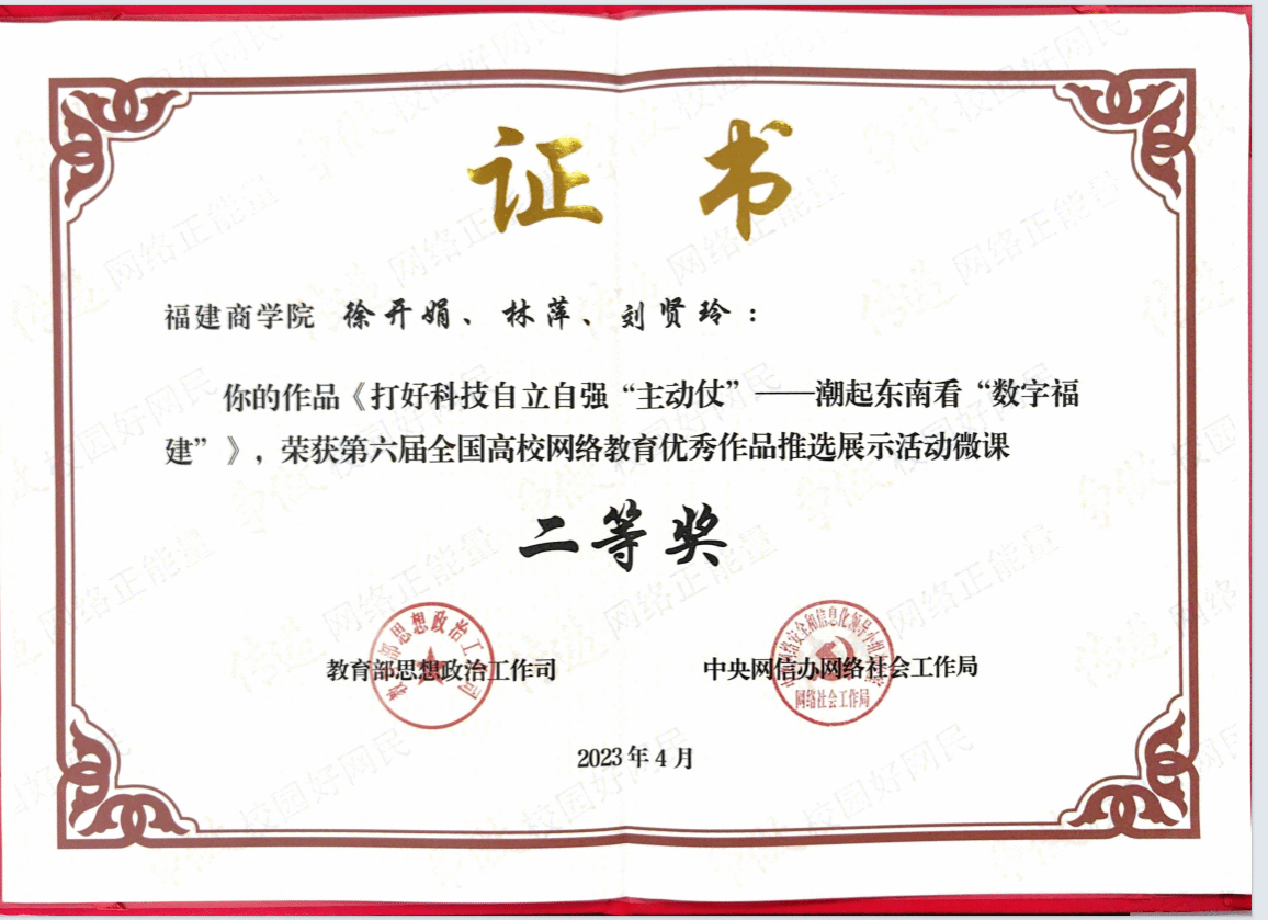 beat365徐开娟老师的作品《打好科技自立自强“主动仗”-----潮起东南看“数字福建”》,荣获第六届全国高校网络教育优秀作品推选展示活动微课二等奖。