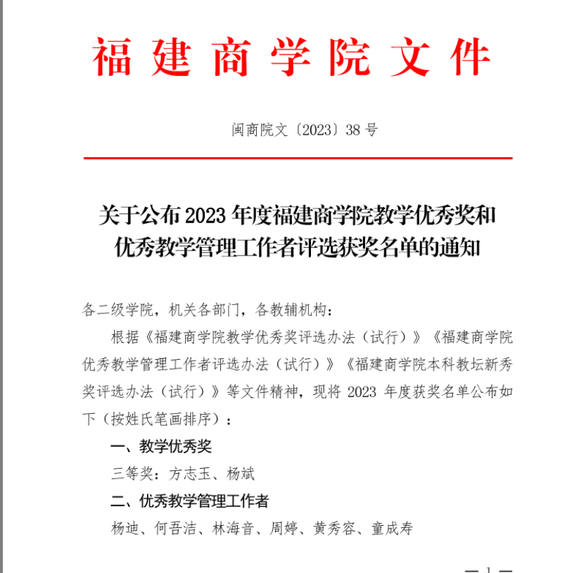 喜讯:beat365周婷老师获得2023年度福建商学院优秀教学管理工作者荣誉称号
