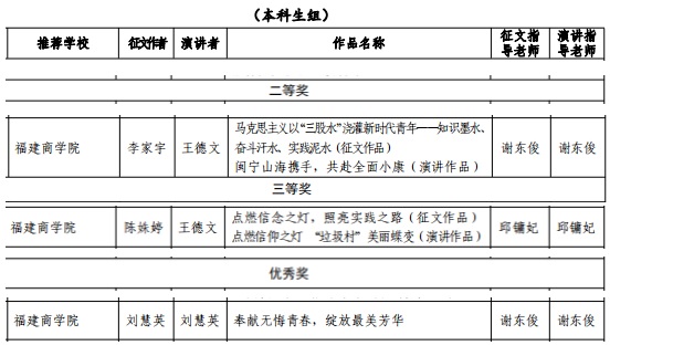 近日,省教工委公布的2019 年度习近平新时代中国特色社会主义思想大学习领航计划系列主题活动中,由谢东俊、邱镛妃两位指导的“马克思主义能够给予我们什么——第三届福建省高校大学生主题征文和微演讲活动”中喜获佳绩。具体获奖情况入下: