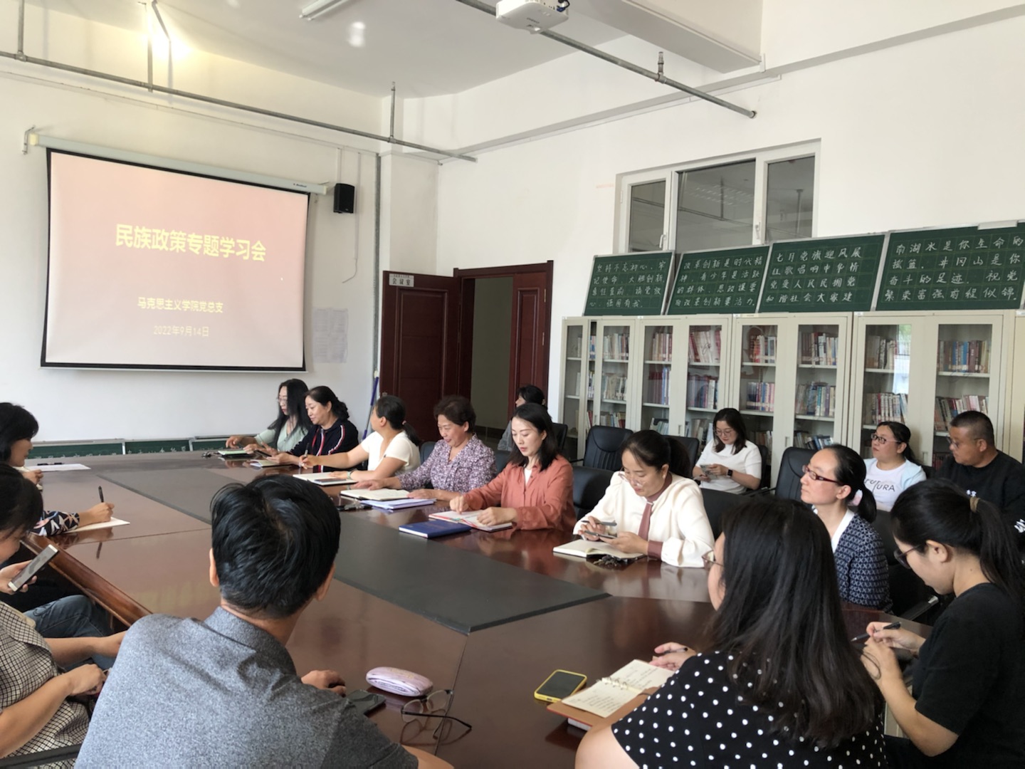深入开展铸牢中华民族共同体意识教育,促进民族团结进步,2022年9月14日,pg游戏电子模拟器党总支理论学习中心组扩大学习会在崇文楼B123会议室召开专题学习。会议由党总支书记刘凤琴主持,学院全体教师参加。会上集中学习了《内蒙古自治区促进民族团结进步条例》、《内蒙古自治区教育条例》和《中华人民共和国国家通用语言文字法》等法律法规,同时要求各位老师自学《民族区域自治法》。