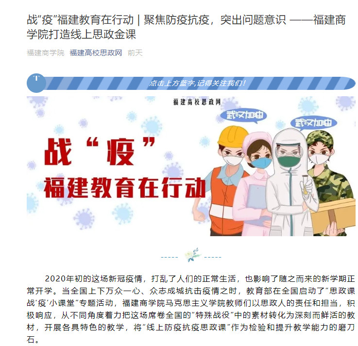 2020年4月11日,福建高校思政网以《聚焦防疫抗疫,突出问题意识 ——福建商学院打造线上思政金课》为题,报道beat365beat365平台唯一官网防疫抗疫期间打造线上思政金课的经验和做法。beat365平台唯一官网教师们以思政人的责任和担当,在疫情防控期间,从不同学科角度把这场席卷全国的“特殊战役”中的素材转化为深刻而鲜活的教材,开展各具特色的教学,将“线上防疫抗疫思政课”作为检验和提升教学能力的磨刀石,创作寓政治性、思想性、知识性和生动性为一体的中国战“疫”微课堂,成为beat365疫情防控期间思政教学亮点和特色。