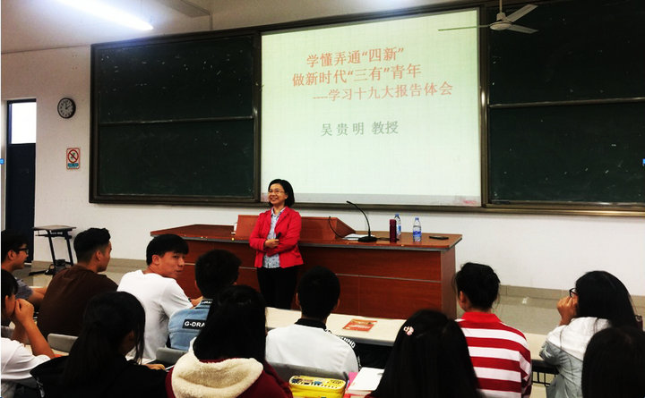 11月10日下午,福建省委党校吴贵明教授应邀为beat3652017级工管系学生上了题为《学懂弄通“四新” 做新时代“三有”青年》的形势与政策课。