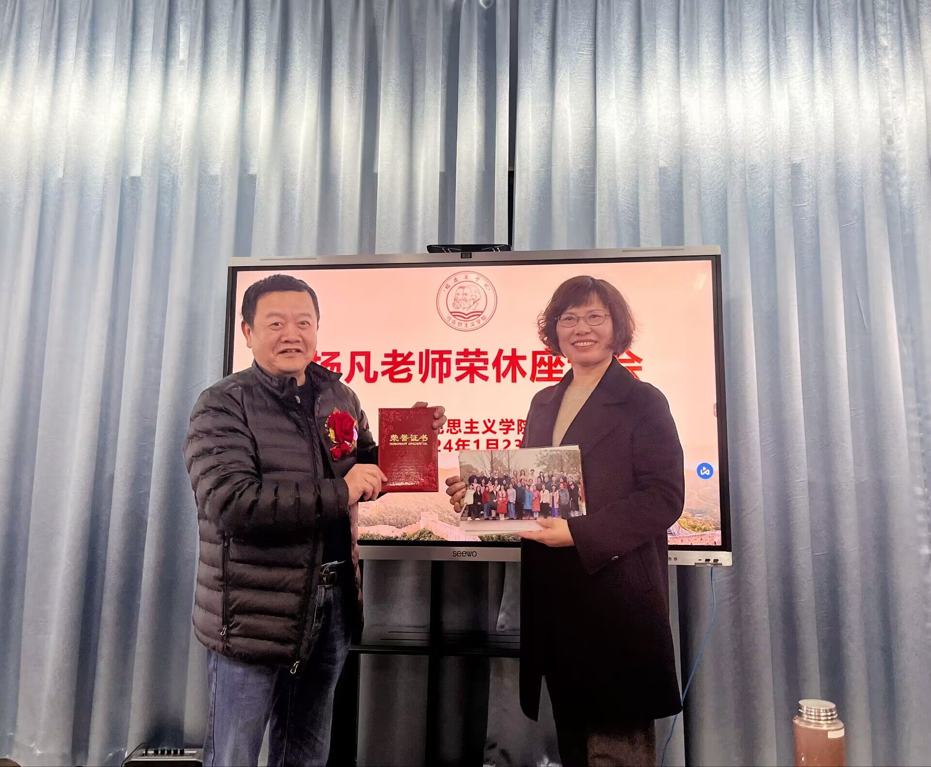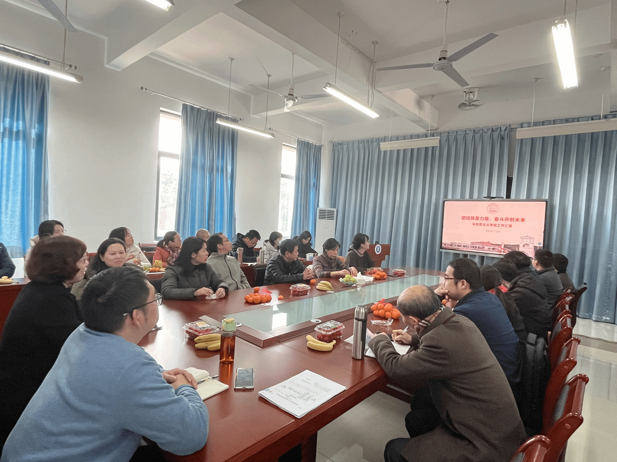 2024年1月23日下午,beat365召开本学期期末工作安排会议暨杨凡老师荣休欢送会。beat365平台唯一官网全体教师参加。