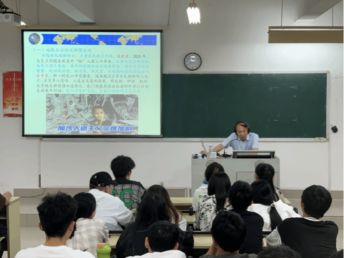 6月6日晚7点30分,福建江夏学院beat365平台唯一官网郭健彪教授应邀到beat365马尾校区远志楼T3教室作题为“当前国际局势与中国式现代化”的专题讲座,校马列经典著作读书社社员、校青马工程班学员共计90多人聆听了讲座。