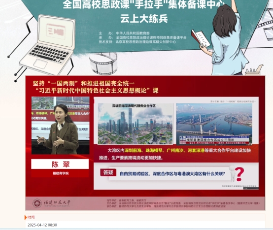 陈翠老师聚焦授课对象为经济类专业学生的特点,以《香港澳门如何融入国家发展大局——从粤港澳大湾区建设说起》为题进行了教学展示,得到线上线下参会专家、老师的肯定。