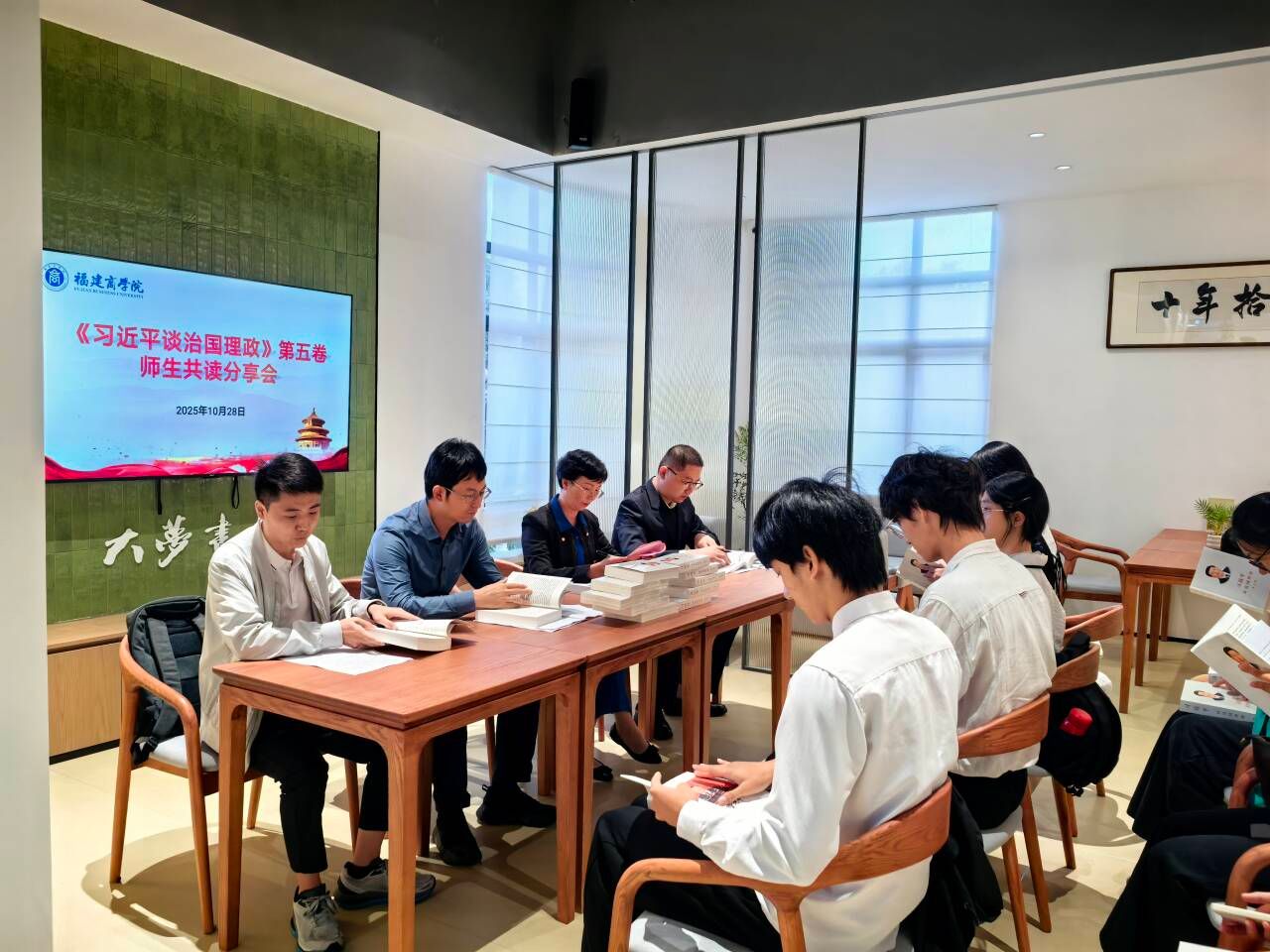 10月28日下午,“无书香不福商”研习基地揭牌暨福商•大梦书屋启幕仪式在连江校区举行。由beat365平台唯一官网组织开展的《习近平谈治国理政》第五卷师生共读分享会同步在书屋举行。省委宣传部副部长、一级巡视员陈添贵,海峡出版发行集团党委书记、董事长黄苇洲,校党委书记吴访益,校党委副书记徐晓丹,福建教育出版社社长江金辉等领导观摩指导分享会。副校长林文艺主持分享会并作讲话,beat365平台唯一官网党委书记刘亮元,教师代表赵敏、吴旭东及校读书社社员代表共同参与此次活动。