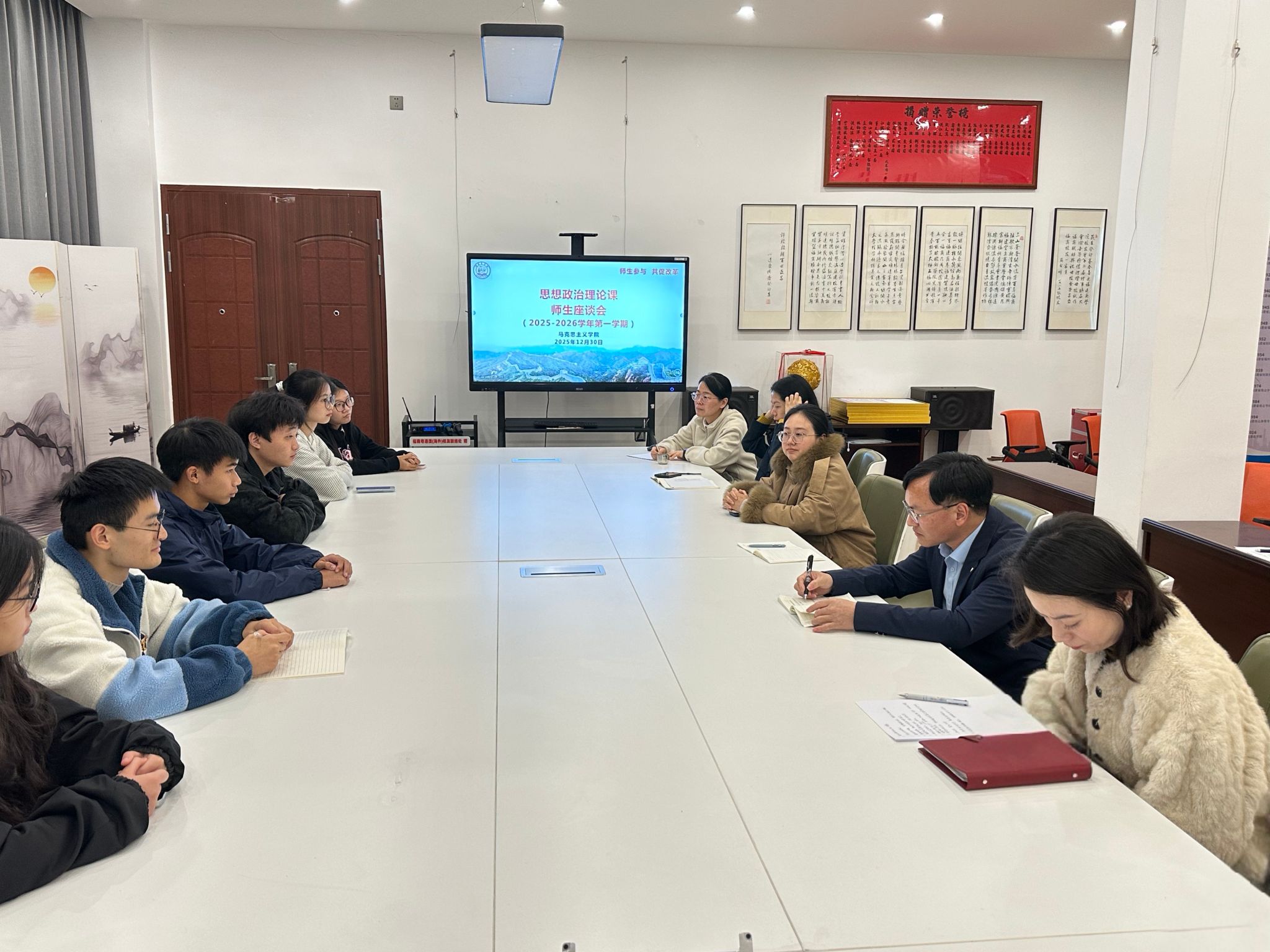 2025年12月30日,beat365平台唯一官网在鼓楼校区召开2025-2026学年第一学期思政课师生座谈会。教务处、质评处、beat365平台唯一官网有关人员,校院教学督导,beat365平台唯一官网各教研室主任参加座谈会听取学生代表意见建议。