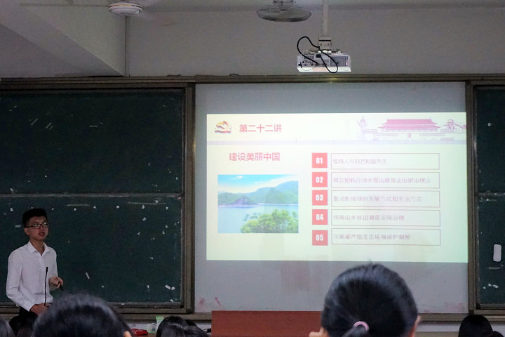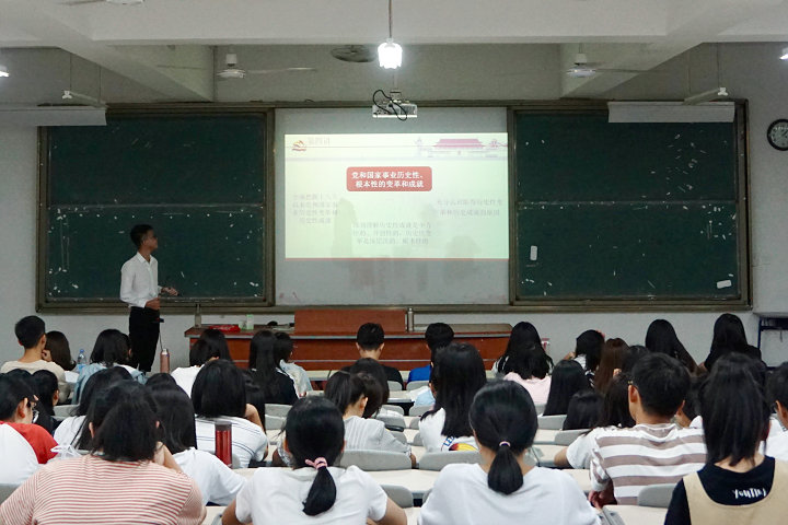 9月26日晚,beat365习近平新时代中国特色社会主义思想读书社在连江校区诚信楼大阶一教室开展第二场学生小分队“大宣讲”活动。本次宣讲以“《习近平新时代中国特色社会主义思想三十讲》导读”为主题,由读书社理论骨干宣讲小分队成员、福建省第二季大学生学习马克思主义理论知识竞赛本科组冠军苏金楼同学面向管理工程系2018级会展经济与管理专业的新生进行宣讲。