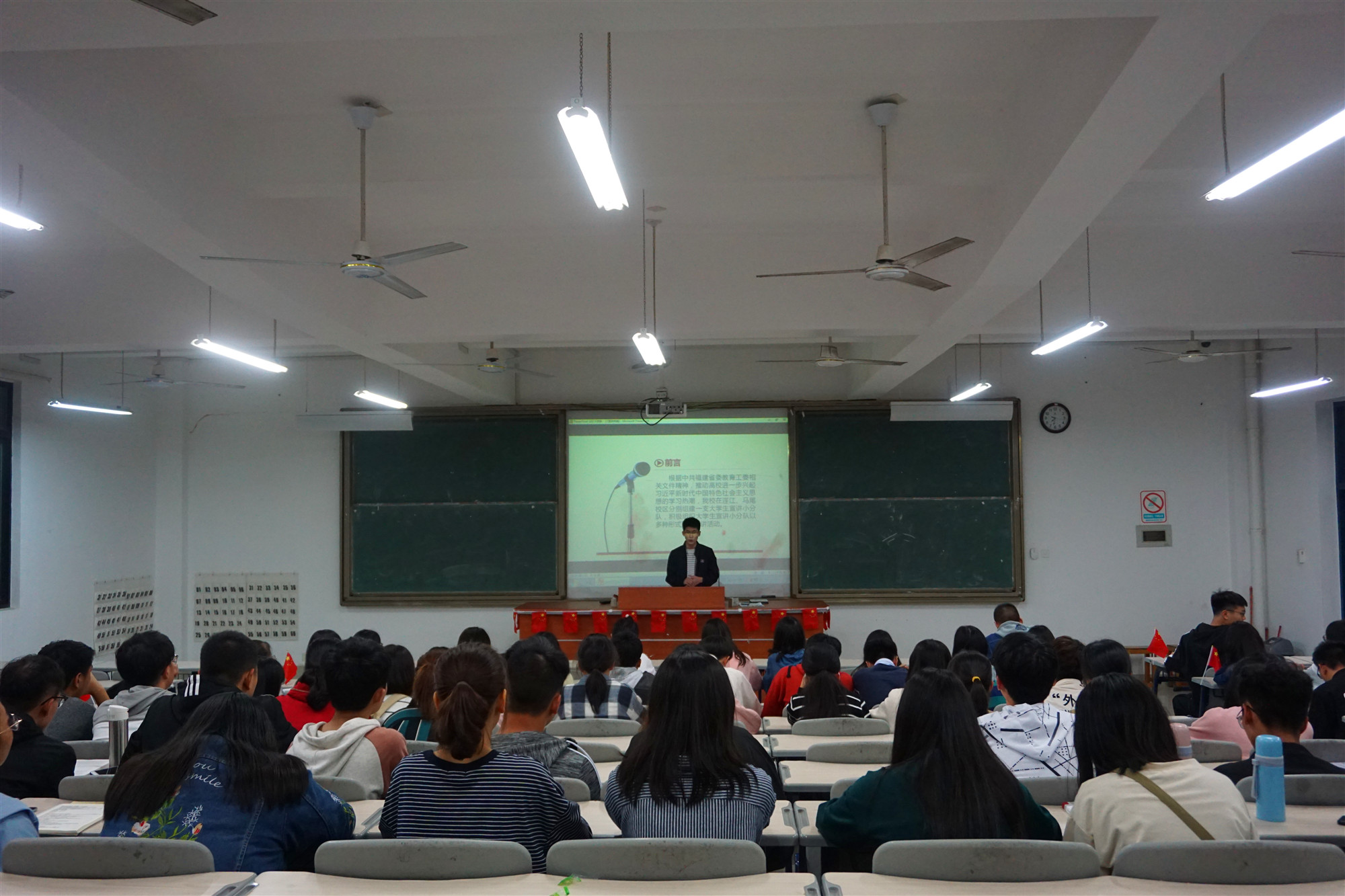桂花飘香,秋雨微凉。10月21日晚,福建商学院习近平新时代中国特色社会主义思想读书社学生宣讲小分队成员林威同学于连江校区诚信楼中阶一开展了以“坚定马克思主义信仰,不辱时代使命,不负人民期望”为主题的宣讲活动。参加此次活动的为读书社一班第三、四、五组的社员们近80名同学。