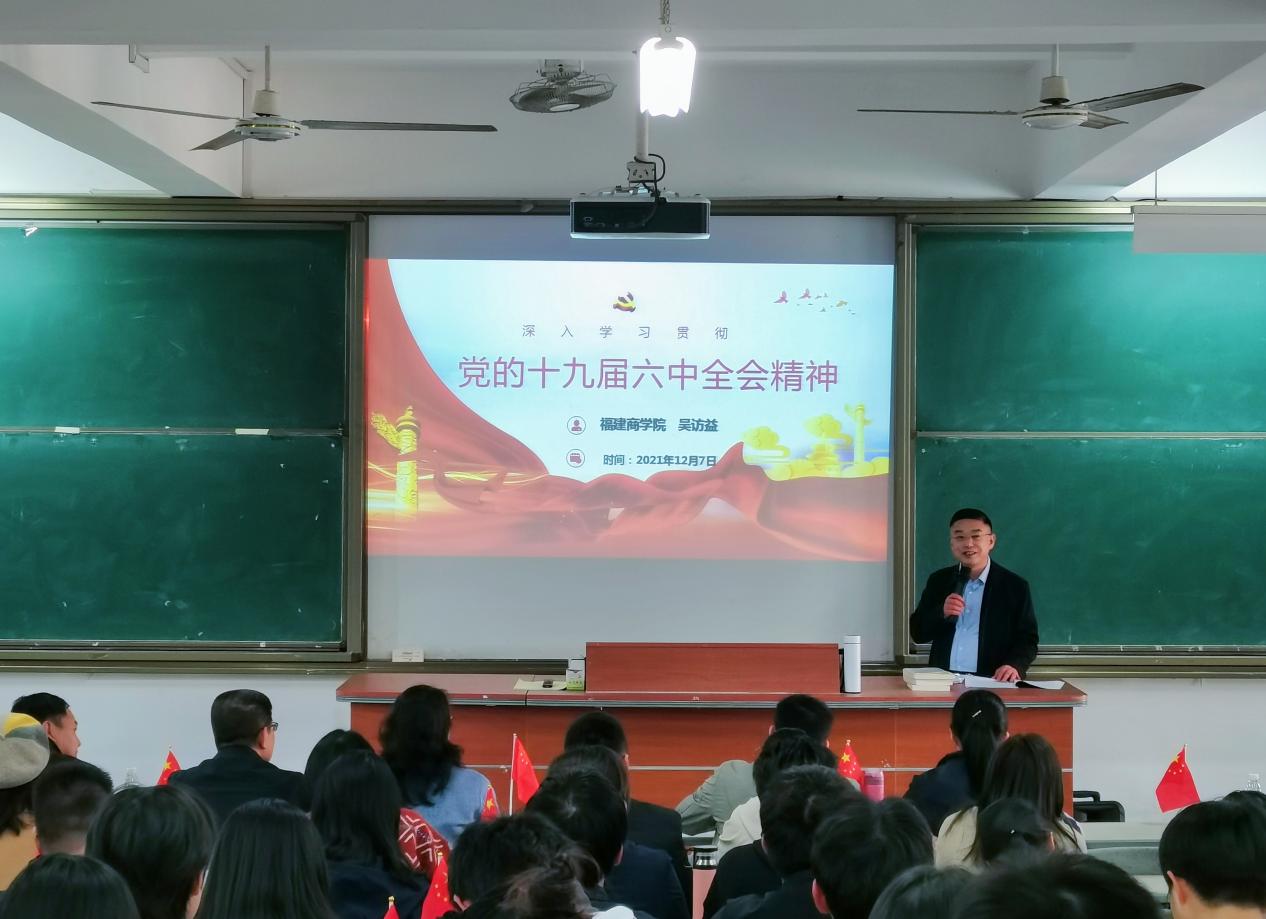 12月7日下午,校党委副书记吴访益在连江校区诚信楼中阶4教室作题为“深入学习贯彻党的十九届六中全会精神暨学习福建省第十一次党代会精神”的主题宣讲,有关处室负责人、beat365平台唯一官网全体教职工、校习近平新时代中国特色社会主义思想读书社全体成员共120多人参加了宣讲会。