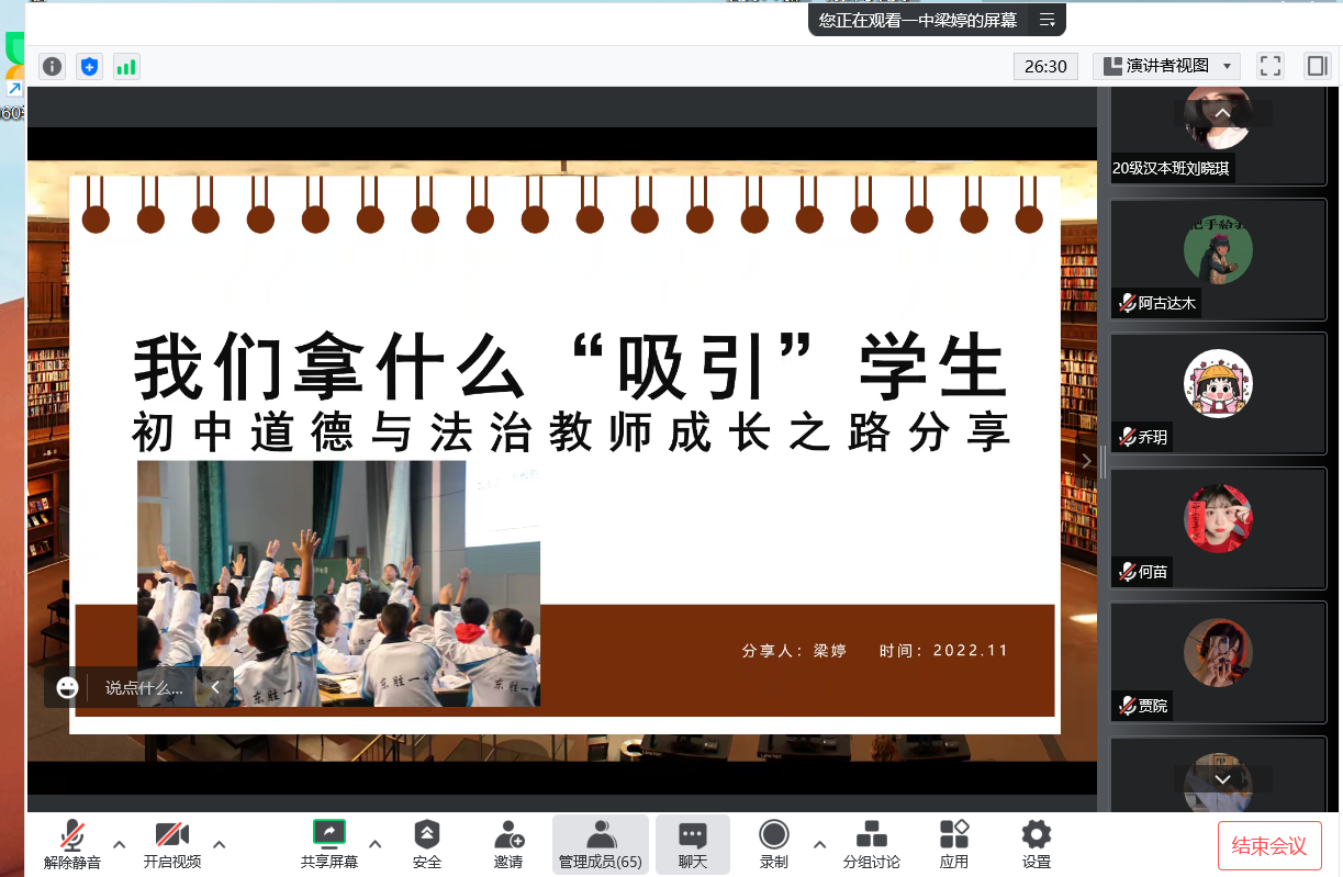 为了更好适应教育部师范类专业认证的新要求,进一步加强专业建设,11月5日,pg游戏电子模拟器组织开展“中学政治教师素质养成”系列讲座的第二讲,邀请到鄂尔多斯市东胜区第一中学梁婷老师为学院学生作“初中道德与法治教师成长之路分享”线上主题讲座。讲座由学院吴娇老师主持,学院全体学生在线参加。