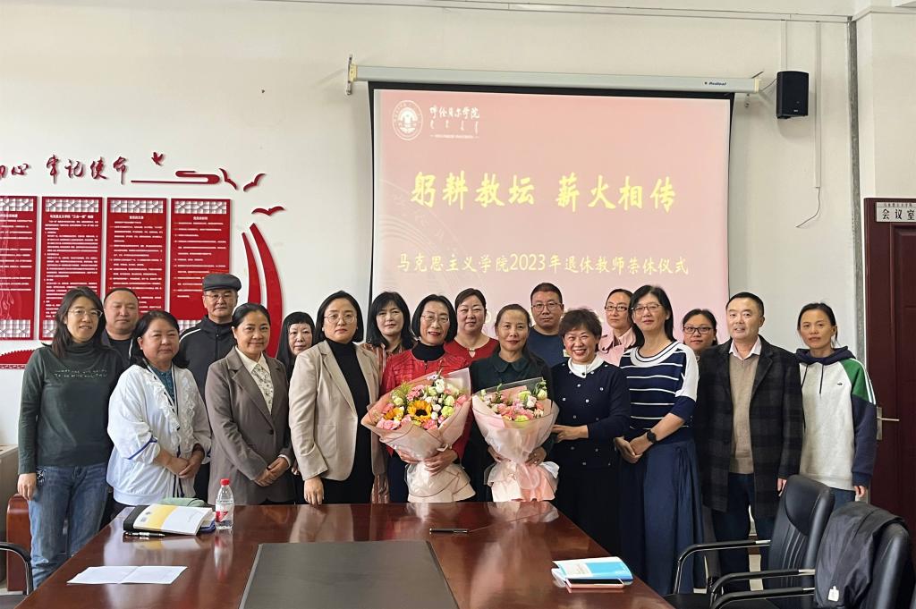 吴秀芳院长代表学院领导班子向荣休老师致欢送词,肯定了荣休教师对学院发展起到的决定性作用,感谢了各位荣休教师多年来对学院发展建设的辛勤付出,并祝愿他们今后的生活幸福安康。两位荣休教师分别发表了自己的荣休感言,畅谈了自己从教三十余载的经历,抒发了对教育事业的深厚感情和对学校的感激与眷恋,表达了对学校、学院的感谢和祝福。学院老教师代表和青年教师纷纷进行了发言,表示要传承马院教师优秀的敬业精神,树立远大志向,做一名有教育情怀,热爱工作,热爱学生的好教师。随后,青年教师代表为两位荣休老师献花。
